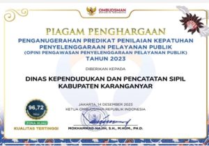 Dinas Kependudukan dan Pencatatan Sipil Kabupaten Karanganyar mendapat Piagam Penghargaan Penganugerahan Predikat Penilaian Kepatuhan Penyelengaraan Pelayanan Publik Tahun 2023.