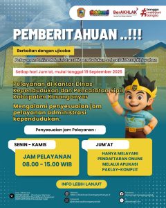 Berkaitan dengan dilakukannya uji coba Pelayanan Online Administrasi Kependudukan selesai di Desa/Kelurahan, kami sampaikan penyesuaian jadwal jam pelayanan adminduk di Kantor Dinas Kependudukan dan Pencatatan Sipil Kabupaten Karanganyar, untuk hari Senin- Kamis Jam Pelayanan 08.00-15.00 WIB, Jumat HANYA MELAYANI PEDAFTARAN ONLINE MELALUI APLIKASI PAKLAY-KOMPLIT.